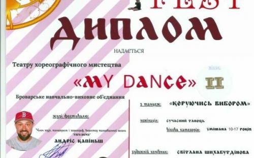 За підсумками Всеукраїнського фестивалю дитячої та юнацької творчості «МануFEST» відзначено вихованців Театру хореографічного мистецтва «MY DANCE» (художній керівник Шихабутдінова Світлана Миколаївна) Центру позашкільної освіти Броварського навчально-виховного об’єднання.