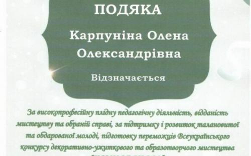 За підсумками Всеукраїнського конкурсу декоративно-ужиткового та образотворчого мистецтва «Казкове Різдво» відзначено Дипломом за ІІ місце вихованку Центру позашкільної освіти Броварського навчально-виховного об’єднання Власенко Варвару, за роботу «Коляда моя лунає, увесь світ з Різдвом вітає» у номінації – графіка та Подякою керівника гуртка «Розфарбований світ» Олену Карпуніну за високопрофесійну плідну педагогічну діяльність, відданість мистецтву та обраній справі, за підтримку і розвиток талановитої та обдарованої молоді.