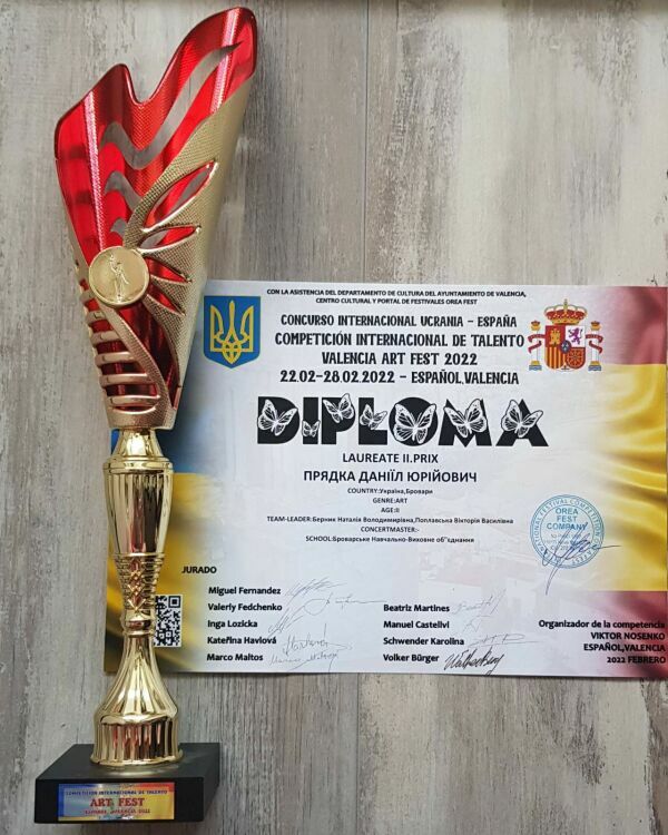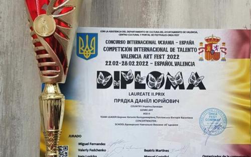 Вітаємо Даніїла, учня 5 класу ЗОШ І-ІІ ступенів БНВО (класний керівник Вікторія Поплавська), із зайнятим ІІ місцем у Міжнародному багатожанровому, двотуровому конкурсі "VALENCIA ART FEST 2022 - SPAIN", Україна - Іспанія (дистанційно).