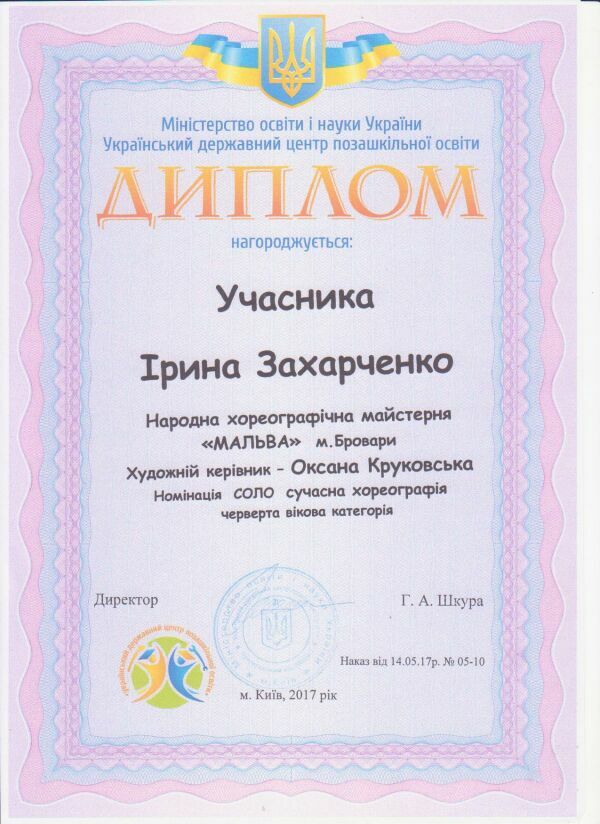 - Диплом учасника – отримала Ірина Захарченко, номінація «СОЛО сучасна хореографія», четверта вікова категорія;