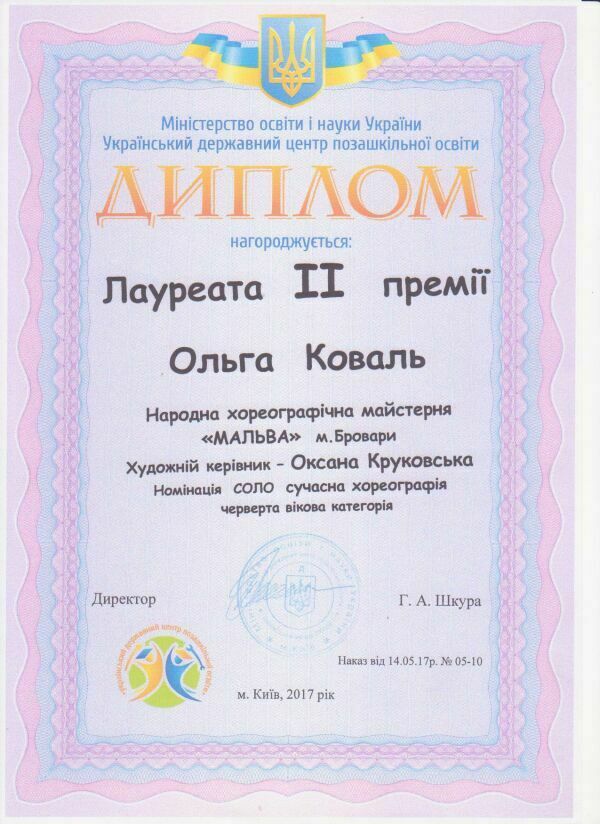 - Диплом II місце – отримала Ольга Коваль, номінація «СОЛО сучасна хореографія», четверта вікова категорія;