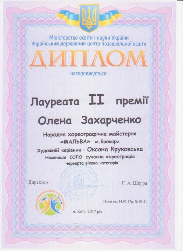 Міністерство освіти і науки України Український державний центр позашкільної освіти висловив ПОДЯКУ керівнику Народної хореографічної майстерні «Мальва» Круковській Оксані Олексіївні "За вагомий внесок в естетичне виховання творчої молоді та професійну підготовку учнів до участі у VI Міжнародному конкурсі «Перлини мистецтва». Ваш внесок у розвиток культури та мистецтва є важливим і потрібним, і це є великим прикладом для виховання молоді.