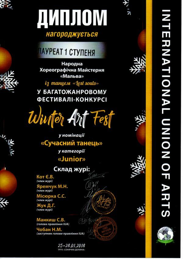 Диплом лауреата І ступеня – старша група, номінація «Сучасний танець», категорія «Junior», танець «Lost souls»;