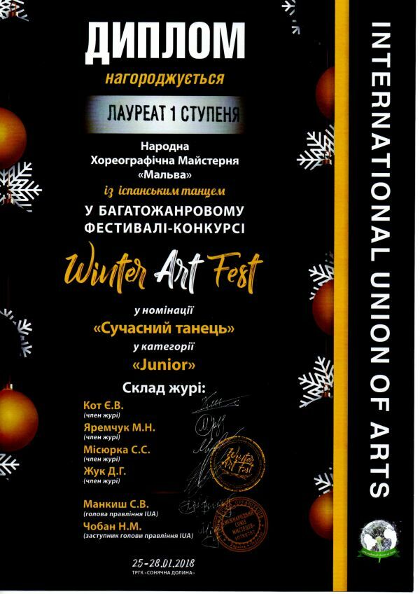 Диплом лауреата І ступеня – старша група, номінація «Сучасний танець», категорія «Junior», танець «Іспанський»;