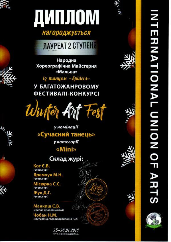 Диплом лауреата ІІ ступеня – підготовча група, номінація «Сучасний танець», категорія «Mini», танець «Spider men»;