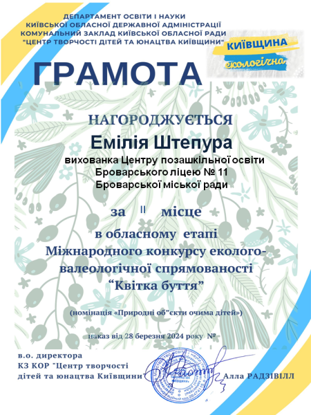 За підсумками обласного етапу Міжнародного конкурсу еколого-валеологічної спрямованості «Квітка буття» вихованка Центру позашкільної освіти Броварського ліцею № 11 посіла ІІ місце: