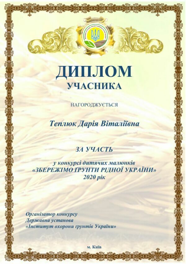 За підсумками конкурсу дитячих малюнків «Збережемо ґрунти рідної України» дипломами за участь відзначено вихованців гуртка «Розфарбований світ» Центру позашкільної освіти Броварського навчально-виховного об’єднання (керівник гуртка Карпуніна Олена Олександрівна).