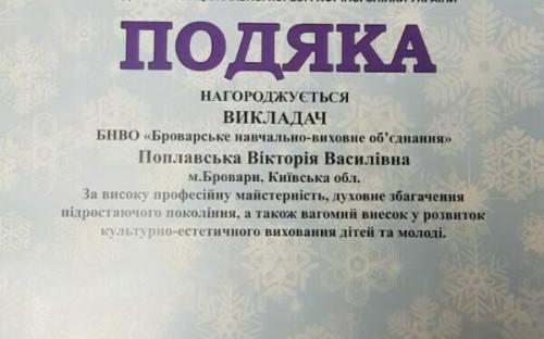 Прядку Даніїла, учня 5 класу ЗОШ І-ІІ ступенів Броварського навчально-виховного об’єднання (класний керівник Вікторія Поплавська) за зайняте І місце у Всеукраїнському двотуровому конкурсі мистецтв «Новорічні дива», який проходив з 16 по 19 грудня 2021 року. На розгляд журі у номінації «Образотворче мистецтво» конкурсант подав такі твори: «Білий лев», «Мама з дитинчам жирафів», «Поросята».