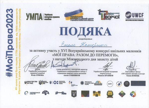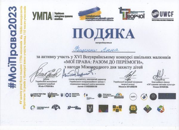 За підсумками XVI Всеукраїнського шкільних малюнків «Мої права: разом до ПЕРЕМОГИ» з нагоди Міжнародного захисту дітей відзначено Подяками за активну участь і підтримку вихованців і керівників гуртків Центру позашкільної освіти Броварського ліцею №11.