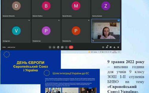 9 травня 2022 року класні керівники провели для учнів 1-9 класів ЗОШ І-ІІ ступенів БНВО виховну годину «День Європи в Україні». Метою заходу стала популяризація загальноєвропейських культурних надбань та формування позитивної громадянської думки щодо євроінтеграційного курсу нашої країни.