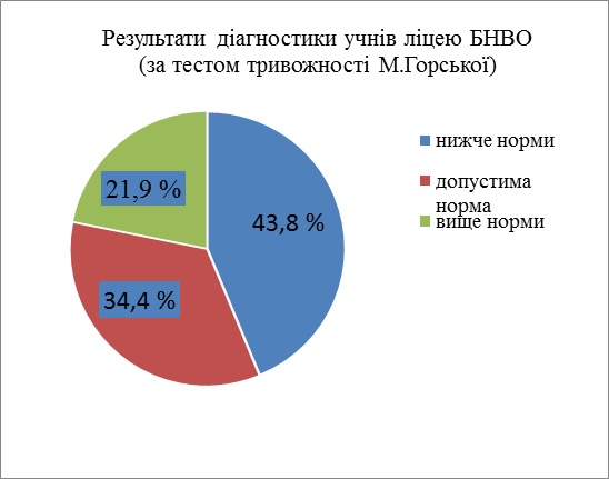 10 вересня 2015 року з учнями 10-11-х класів Ліцею технологічного профілю БНВО практичний психолог Орещенко А.І. провела «Модифікований тест тривожності М.Горської».