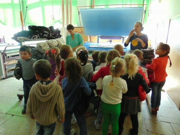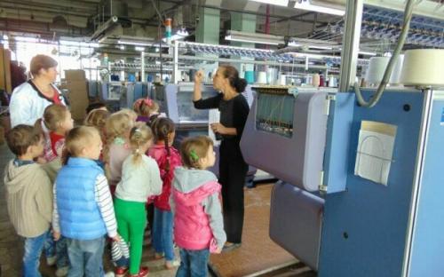 Перша екскурсійна зупинка відбулася у ткацькому цеху, дошкільнята спостерігали за роботою в’язальних машин, які працюють за допомогою комп’ютера, дізналися про те, що кожна машина облаштована спеціальним світлофором, який попереджає в’язальницю про поломку, зупинку машини. На власні очі побачили як створюється трикотажне полотно. Друга зупинка відбулася у цеху де прасують трикотажні вироби, діти спостерігали за роботою прасувальниці, яка працює з величезною паровою праскою. Після прасування трикотажне полотно акуратно складається та відправляється до швейного цеху, куди й запросили наших дошкільнят.