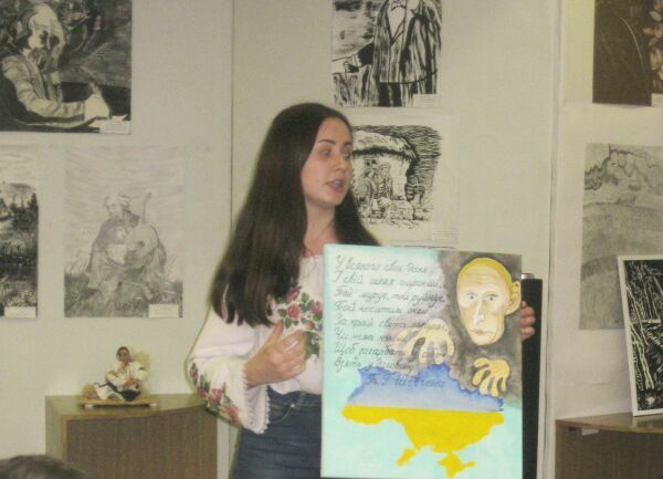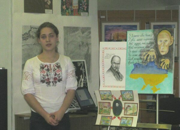 Главачек Поліна, учениця 9 класу Броварської ЗОШ І-ІІІ ст. № 9, представила малюнок про сьогодення України на основі творів Кобзаря;